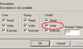 – إذا ظهرت هذه الوظيفة في واجهة رسومية، قم بتأشير المربعات المناسبة لامتياز «Write» الخاص بمجموعة «Others» (او «World» او «All users»):
