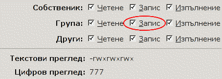 - Ако това свойство се появи като графичен интерфейс, отбележете кутийката, отговаряща на "Запис" за "Други" (или "Целият свят" или"Всчки потребители"):