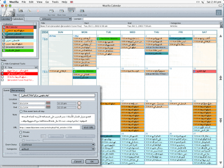 – الى اليمين في الاطار الرئيسي، تظهر «المواعيد» داخل روزنامة رسومية (هنا عرض شهري): بالاخضر مثلاً، تواريخ العطل الاسلامية وبالاحمر المواعيد الشخصية وبالالوان الاخرى المقالات المنشورة في مختلف المواقع.