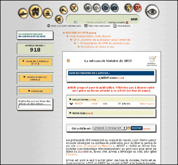 Erwan era llavors l’únic en saber gestionar una base de dades, Pierre s’estava iniciant al PHP, i ARNO* no coneixia ni PHP ni les bases de dades. Però Pierre passa les seves vacances en un vaixell que porta el nom d’«SPIP»; i com que «SPIP» és l’acrònim de «Sistema de Publicació per Internet» [1], en té suficient per llançar el projecte: tenen el títol, la resta hauria de resultar senzill...