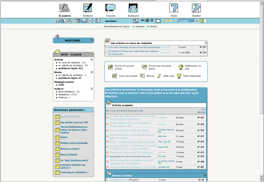 Cette nouvelle version de SPIP constitue l’aboutissement de plus d’une année de travail (la version 1.7 date en effet de janvier 2004), et il est impossible d’en lister ici toutes les nouveautés de façon exhaustive.