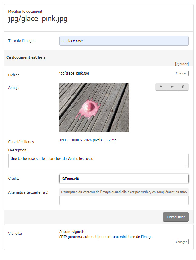 | Supprimer l’image | Le fichier de l’image est supprimé du site |