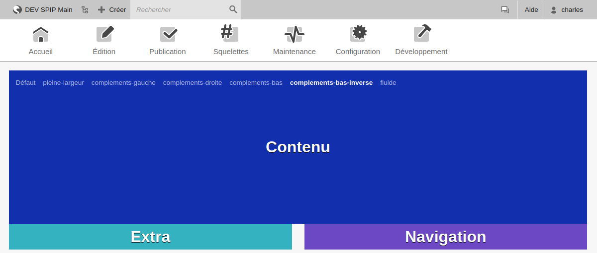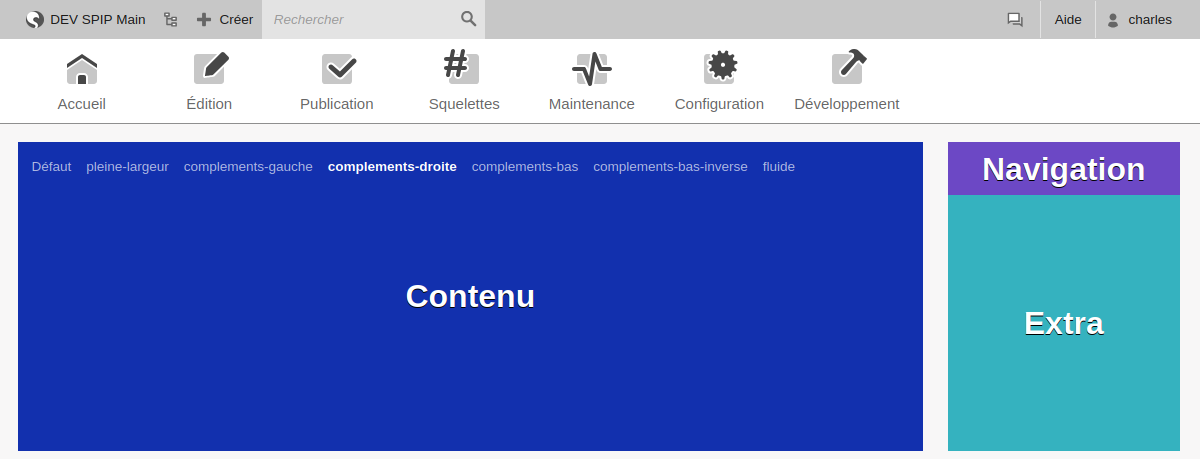 • Nouveaux layouts pour le privé (#LAYOUT_PRIVE) : defaut, fluide, pleine-largeur, complements-droite, complements-bas, complements-bas-inverse