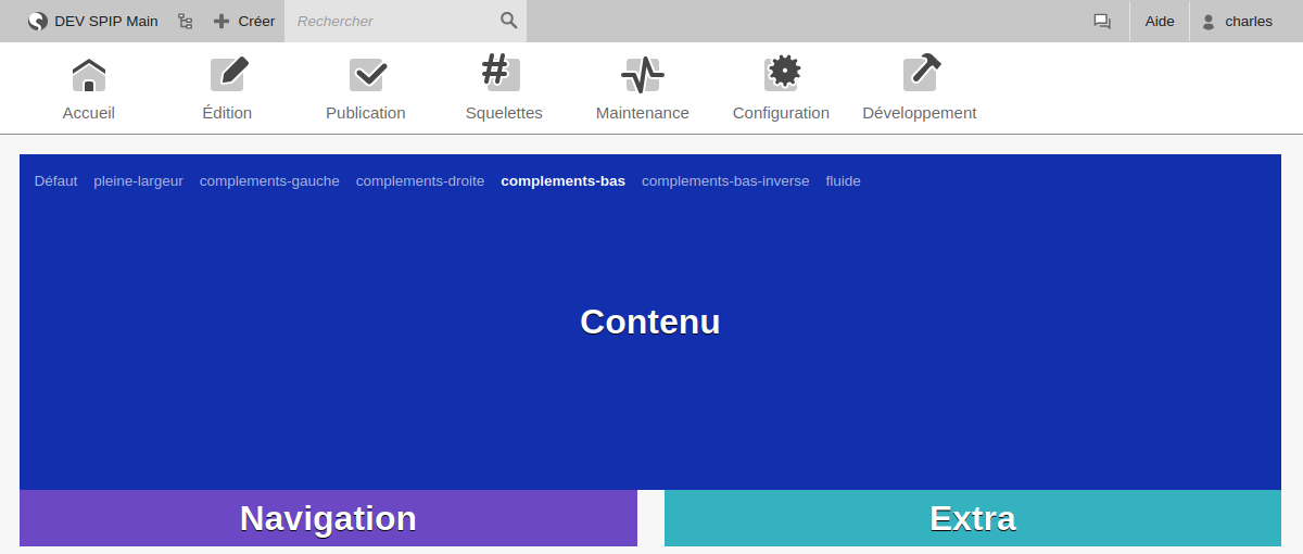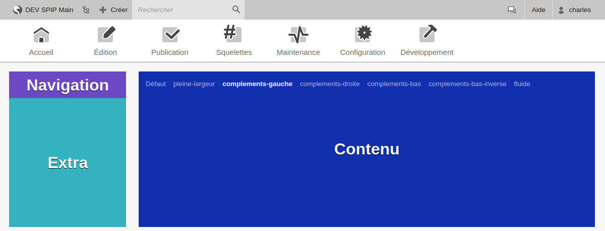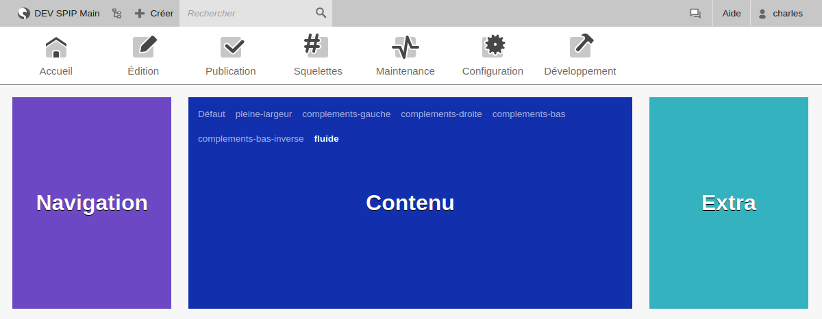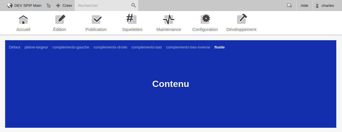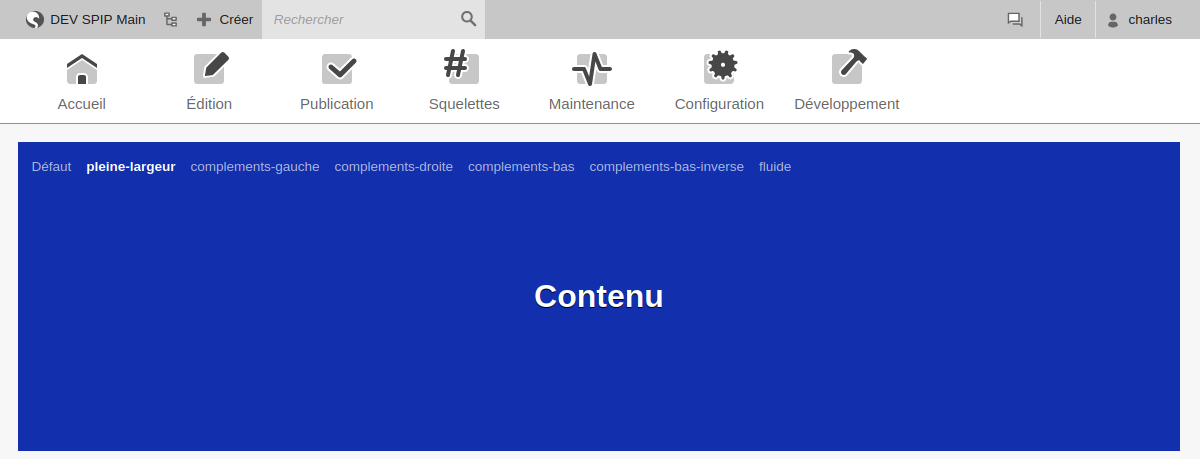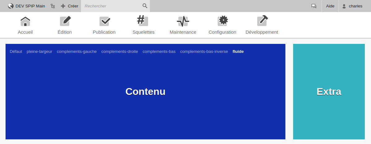 La balise #LAYOUT_PRIVE remplace #LARGEUR_ECRAN et permet d’utiliser de nouvelles dispositions pour les pages de l’espace privé :