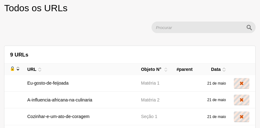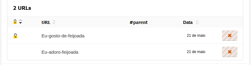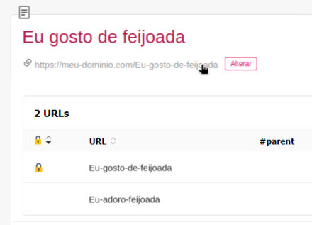 - Os URLs anteriores do objeto são conservados para evitar error 404. As pessoas que tentarem acessar pelos antigos URLs serão automaticamente redirecionadas para o URL principal (identificado com o cadeado).